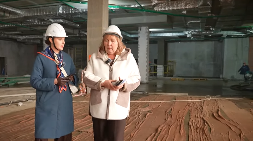 The TV crew was briefed on the construction progress. "The central entrance is unconventional. Bronze bas-reliefs, the design of which is currently being approved by artistic councils, will be installed here. Further on, there will be a stained-glass section, the main entrance, and a rotating exhibition area. The 12 exhibition halls will be located from the second to the fourth floor," Anzhela Bobariko said.