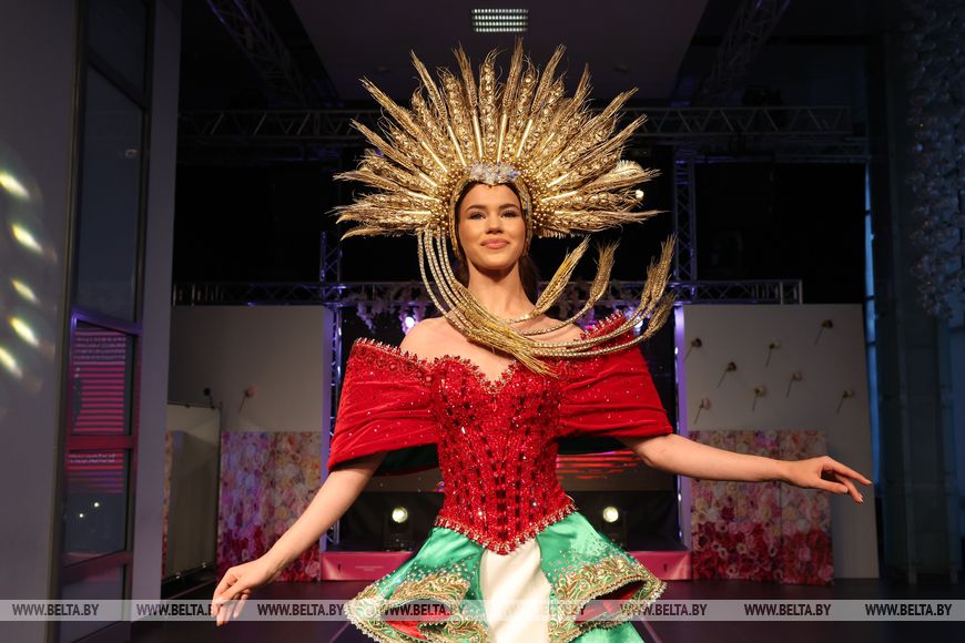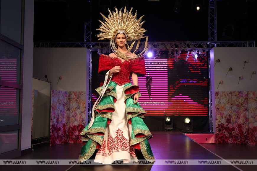 The national costume, created by Belarusian designer Dmitry Titushkin in the style of the national coat of arms and flag, showcases Belarusian national identity. It incorporates 30,000 gems, weighs 11 kg, and took two months to complete. Alena Kucheruk admitted that the costume initially seemed too heavy, but after numerous rehearsals, she grew accustomed to it and now feels comfortable.