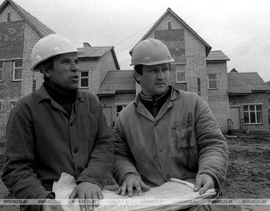Builders constructing a settlement for displaced residents. Dribin District, 1991