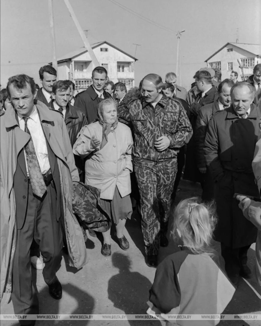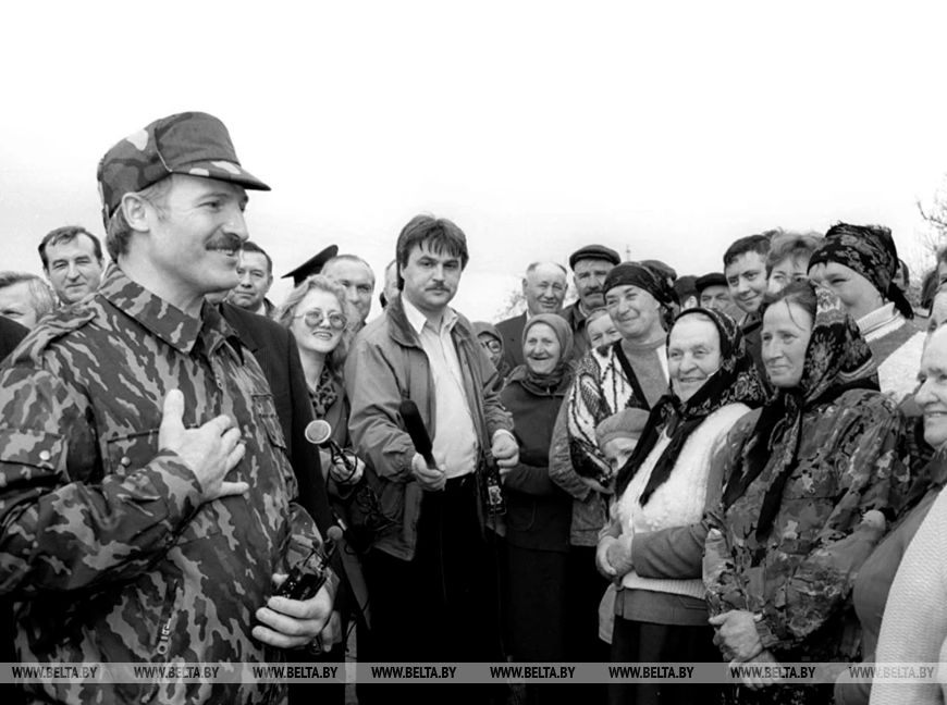 Aleksandr Lukashenko during a visit to a resettlement village in Svensk, Slavgorod District, 1996